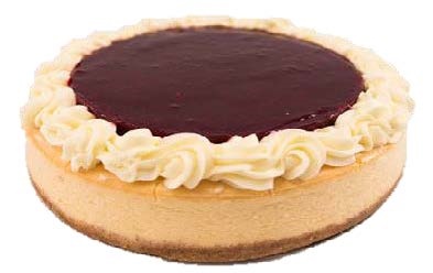 Smooth creamy cheesecake, raspberry topping, biscuit base
